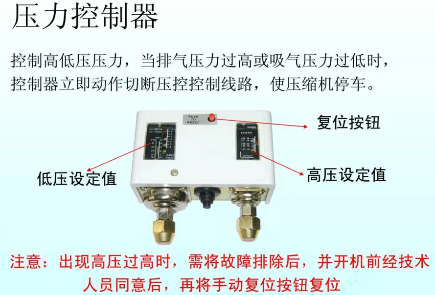 低壓壓力控制器,用于控制低壓壓力或者吸氣壓力。當(dāng)系統(tǒng)缺少制冷劑,或者遇堵塞、忘開閥門,或者熱負(fù)荷過低及其它原因?qū)е碌蛪哼^低時(shí),控制器起跳,斷開接觸器的電路,使壓縮機(jī)停機(jī)保護(hù)壓縮機(jī)不在過低壓力下運(yùn)轉(zhuǎn),提高系統(tǒng)運(yùn)行的經(jīng)濟(jì)性。