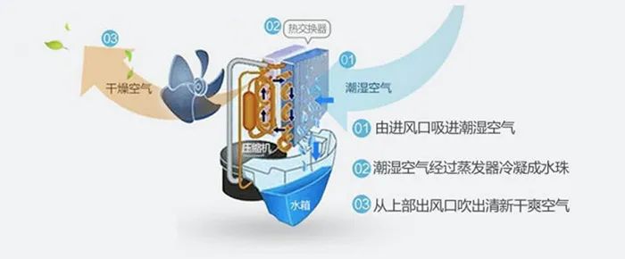 在正常開機的情況下→通過風機的運行→潮濕的空氣從進風口吸入→經過蒸發器→蒸發器將空氣中的水附在鋁片上→變成干燥的空氣→經過冷凝器散熱→從出風口吹出。