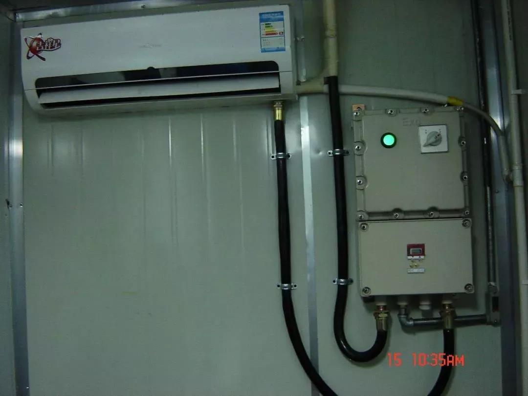 工業(yè)防爆空調(diào)保持普通空調(diào)基礎(chǔ)上,對(duì)電氣系統(tǒng),包括壓縮機(jī)、風(fēng)機(jī)、電氣線路進(jìn)行防爆處理。控制線路采用以光耦固態(tài)繼電器為核心的電氣制系統(tǒng)進(jìn)行整體防爆,原保持原來(lái)空調(diào)的基本功能下,簡(jiǎn)化結(jié)構(gòu),簡(jiǎn)化操作,使設(shè)備在性混合氣體環(huán)境中能安全使用。