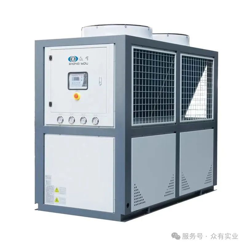 風(fēng)冷式冷水機(jī):冷水機(jī)類型的一種,將常溫的水通過(guò)冷水機(jī)的壓縮機(jī)制冷到一定的溫度以強(qiáng)化冷卻模具或機(jī)器,作為單機(jī)使用,散熱裝置為內(nèi)置之風(fēng)扇,主要有三個(gè)相互聯(lián)系的系統(tǒng):制冷劑循環(huán)系統(tǒng)、水循環(huán)系統(tǒng)、電器自控系統(tǒng)。