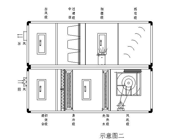 本段起過渡段的連接和機(jī)組內(nèi)部檢修照明用。在過濾段前,表冷段、加熱段、消聲段前后均須設(shè)中間段.